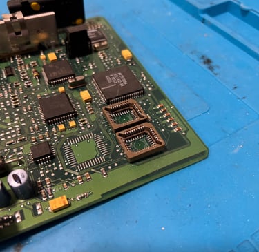Hier müssen die verbauten Speicherchips (EPROMs) zunächst fachgerecht ausgelötet werden.