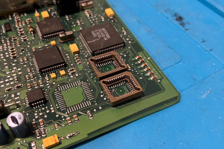 Nach der Bearbeitung werden spezielle Sockel verbaut, sodass die Chips zukünftig einfach gesteckt und erneut programmiert werden können.